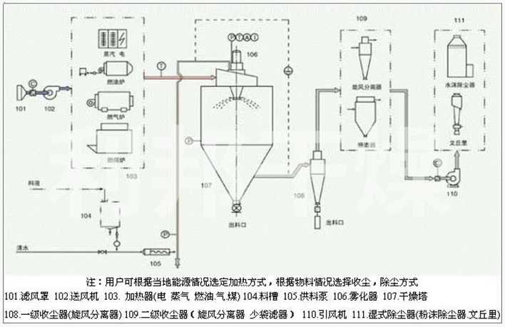 噴霧干燥機為開式循環(huán),并流式,離心式霧化。干燥介質(zhì)空氣經(jīng)過初、中效空氣過濾器過濾后根據(jù)操作指令由鼓風機吸取再經(jīng)加熱器加熱通過高效過濾器的熱風分配器進入噴霧干燥主塔。液體物料根據(jù)操作指令經(jīng)過蠕動泵,進入高速旋轉(zhuǎn)的離心噴頭,在離心力作用下被分散成小霧滴。在噴霧干燥主塔內(nèi),小霧滴與熱風在充分接觸,沿其特定路徑進行熱交換后被干燥成為產(chǎn)品,然后通過旋風分離器實現(xiàn)分離,固體物料被收集,氣體介質(zhì)再經(jīng)過過濾后被排出。整套噴霧系統(tǒng)易清潔、無死角,符合GMP要求。