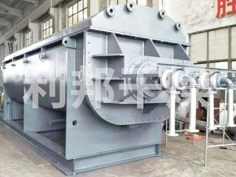 案例描述:高嶺土槳葉干燥機的空心軸上密集排列著楔型中空漿葉,熱介質經空心軸流經漿葉。單位有效容積內傳熱面積很大,熱介質溫度從-40℃到320℃,可以是水蒸汽,也可以是液體型:如熱水、導熱油等。間接傳導加熱,沒有攜帶空氣帶走熱量,熱量均用來加熱物料。