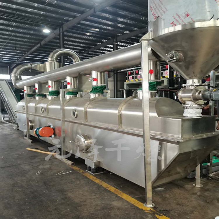 物料自進(jìn)料口進(jìn)入機(jī)內(nèi), 在振動(dòng)力作用下, 物料沿水平方向拋擲向前連續(xù)運(yùn)動(dòng),熱風(fēng)向上穿過(guò)流化床同濕料換熱后, 濕空氣經(jīng)旋風(fēng)分離器除塵后由排風(fēng)口排出, 干燥物料由排料口排出。
