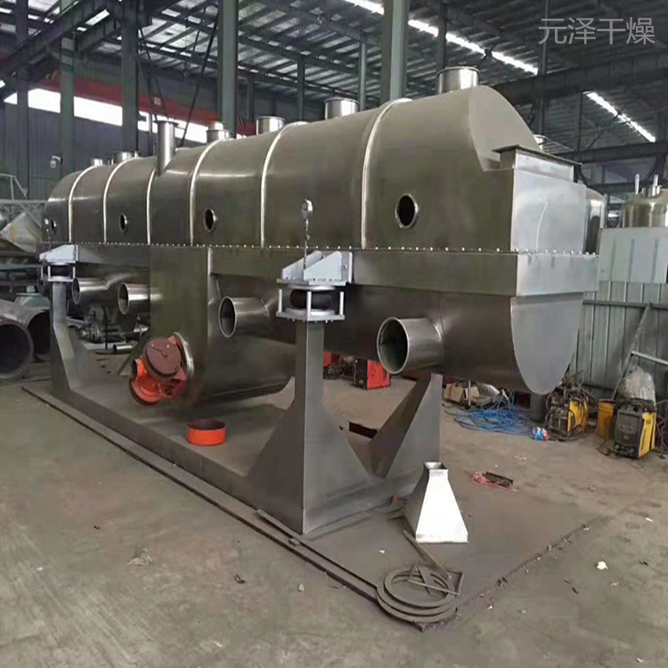 目前應用較廣的臥式振動流化床干燥機,形狀和基本結構與普通臥式流化床干燥機很相似。區(qū)別在于振動流化床整個機體通過彈簧支撐在底座上,多孔板稍向出料端傾斜,機體一側或兩側裝有振動電機。物料依靠機械振動和穿孔氣流雙重作用流化,并在振動作用下向前運動。