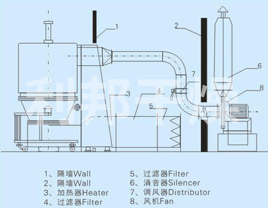 空氣經(jīng)加熱凈化后,由引風機從下部導入,穿過料斗的孔洞板。在工作室內(nèi),經(jīng)攪拌和負壓作用形成流態(tài)化,水份快速蒸發(fā)后隨著排氣帶走,物料快速干燥。