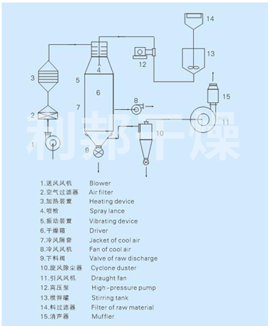 壓力噴霧干燥機(jī)工作過程為:料液通過隔膜泵高壓輸入,噴出霧狀液滴,然后同熱空氣并流下降,大部分粉粒由塔底排料口收集,廢氣及其微小粉末經(jīng)旋風(fēng)分離器分離,廢氣由抽風(fēng)機(jī)排出,粉末由設(shè)在旋風(fēng)分離器下的收粉筒收集,風(fēng)機(jī)出口處還可裝備二級除塵裝置,回收率在96%-98%。