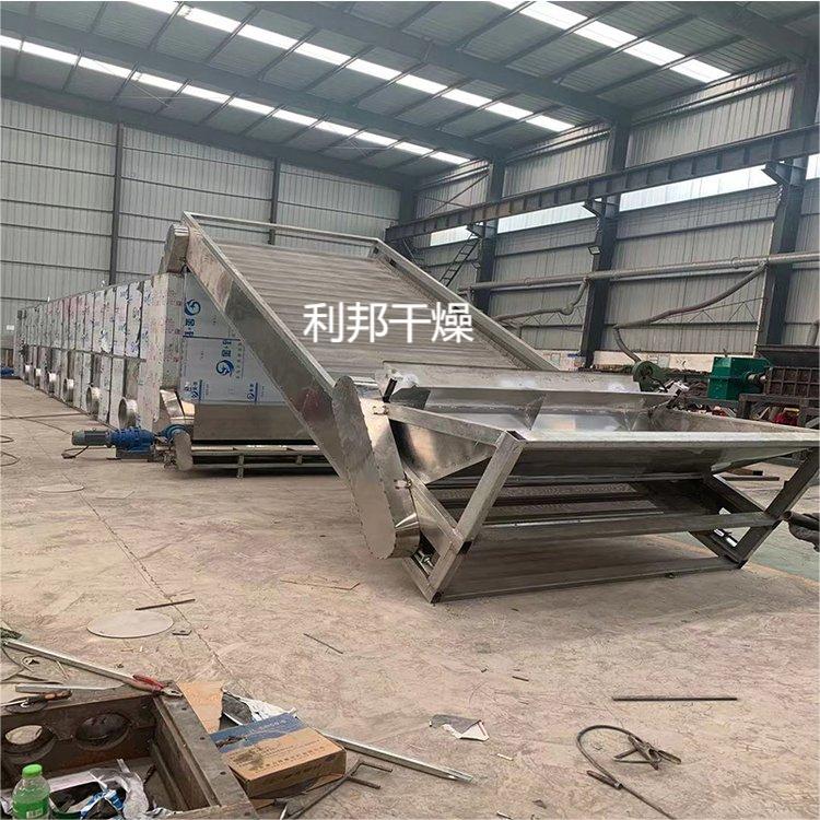物料由加料器均勻地鋪在網(wǎng)帶上,網(wǎng)帶采用12-60目不銹鋼絲網(wǎng)。由傳動(dòng)裝置拖動(dòng)在干燥機(jī)內(nèi)移動(dòng)。干燥機(jī)由若干單元組成,每一單元熱風(fēng)獨(dú)立循環(huán),部分尾氣由專門排濕風(fēng)機(jī)排出,廢氣由調(diào)節(jié)閥控制,熱氣由下往上或由上往下穿過(guò)鋪在網(wǎng)帶上的物料,加熱干燥并帶走水分。網(wǎng)帶緩慢移動(dòng),運(yùn)行速度可根據(jù)物料溫度自由調(diào)節(jié),干燥后的成品連續(xù)落入收料器中。上下循環(huán)單元根據(jù)用戶需要可靈活配備,單元數(shù)量可根據(jù)需要選取。