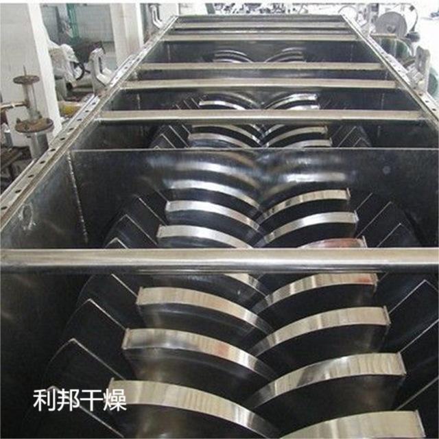 空心軸上密集排列著楔型中空漿葉,熱介質(zhì)經(jīng)空心軸流經(jīng)漿葉。單位有效容積內(nèi)傳熱面積很大,熱介質(zhì)溫度從-40℃到320℃,可以是水蒸汽,也可以是液體型:如熱水、導(dǎo)熱油等。間接傳導(dǎo)加熱,沒有攜帶空氣帶走熱量,熱量均用來加熱物料。熱量損失僅為通過器體保溫層向環(huán)境的散熱。楔型漿葉傳熱面具有自清潔功能。物料顆粒與楔型面的相對運(yùn)動產(chǎn)生洗刷作用,能夠洗刷掉楔型面上附著物料,使運(yùn)轉(zhuǎn)中一直保持著清潔的傳熱面。漿葉干燥機(jī)的殼體為Ω型,殼體內(nèi)一般安排二到四根空心攪拌軸。殼體有密封端蓋與上蓋,防止物料粉塵外泄而充分發(fā)揮作用。