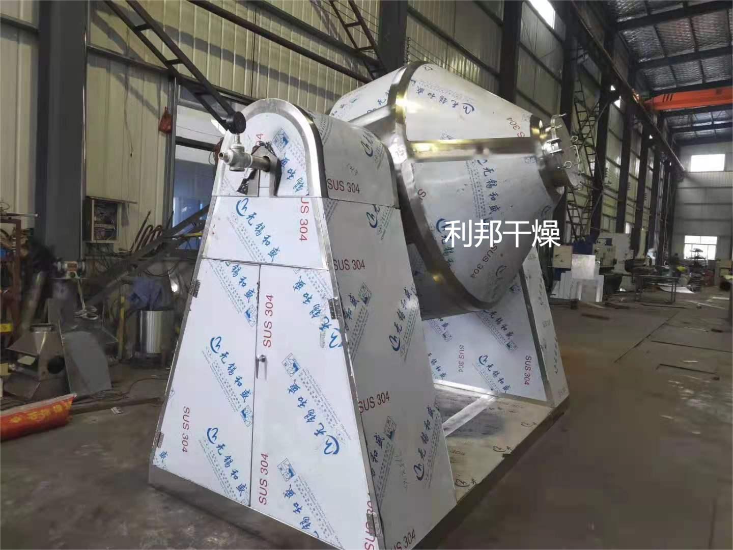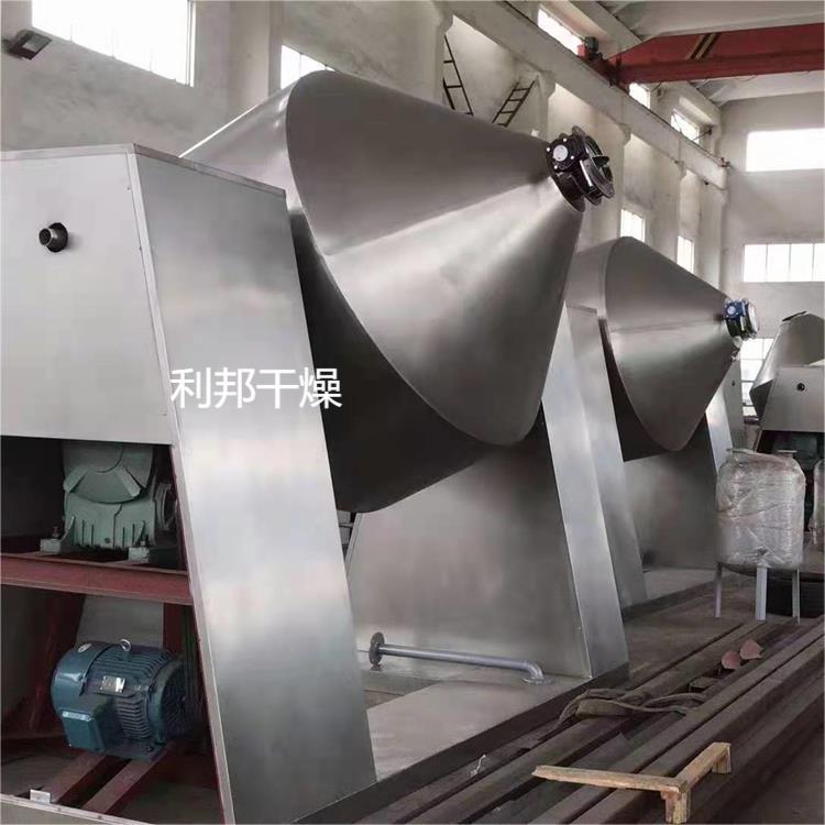 雙錐回轉真空干燥機為雙錐形的回轉罐體,罐內(nèi)在真空狀態(tài)下,向夾套內(nèi)通入蒸汽或熱水進行加熱,熱量通過罐體內(nèi)壁與濕物料接觸,濕物料吸熱后蒸發(fā)的水汽,通過真空泵經(jīng)真空排氣管被抽走。由于罐體內(nèi)處于真空狀態(tài),且罐體的回轉使物料不斷的上下內(nèi)外翻動,故加快了物料的干燥速度,提高干燥效率,達到均勻干燥的目的。雙錐回轉真空干燥機系統(tǒng)主要由雙錐回轉真空干燥機、冷凝器、除塵器、真空抽氣系統(tǒng)、加熱系統(tǒng)、冷卻系統(tǒng)、電控系統(tǒng)等組成。
