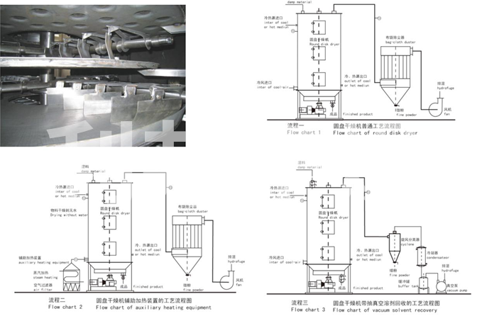 濕物料自加料器連續(xù)地加到干燥器上部層干燥盤上,帶有耙葉的耙臂作回轉運動使耙臂作回轉運動使耙葉連續(xù)地翻抄物料。物料沿指數(shù)螺旋線流過干燥盤表面,在小干燥盤上的物料被移送到外緣,并在外緣落到下方的大干燥盤外緣,在大干盤上物料向里移動并從中間落料口落如下一層小干燥盤中。大小干燥盤上下交替排列,物料得以連續(xù)地流過整個干燥器。中空的干燥盤內通入加熱介質,加熱介質形式有飽和蒸汽、熱水和導熱油,加熱介質由干燥盤的一端進入,從另一端導出。已干物料從后一層干燥盤落到殼體的底層,后被耙葉移送到出料口排出。濕份從物料中逸出,由設在頂蓋上的排濕口排出,真空型盤式干燥器的濕氣由設在頂蓋上的真空泵口排出。從底層排出的干物料可直接包裝。通過配加翅片加熱器、溶劑回收冷凝器、袋式除塵器、干料返混機構、引風機等輔機,可提高其干燥的生產能力,干燥膏糊狀和熱敏性物 料,可方便地回收溶劑,并能進行熱解和反應操作。