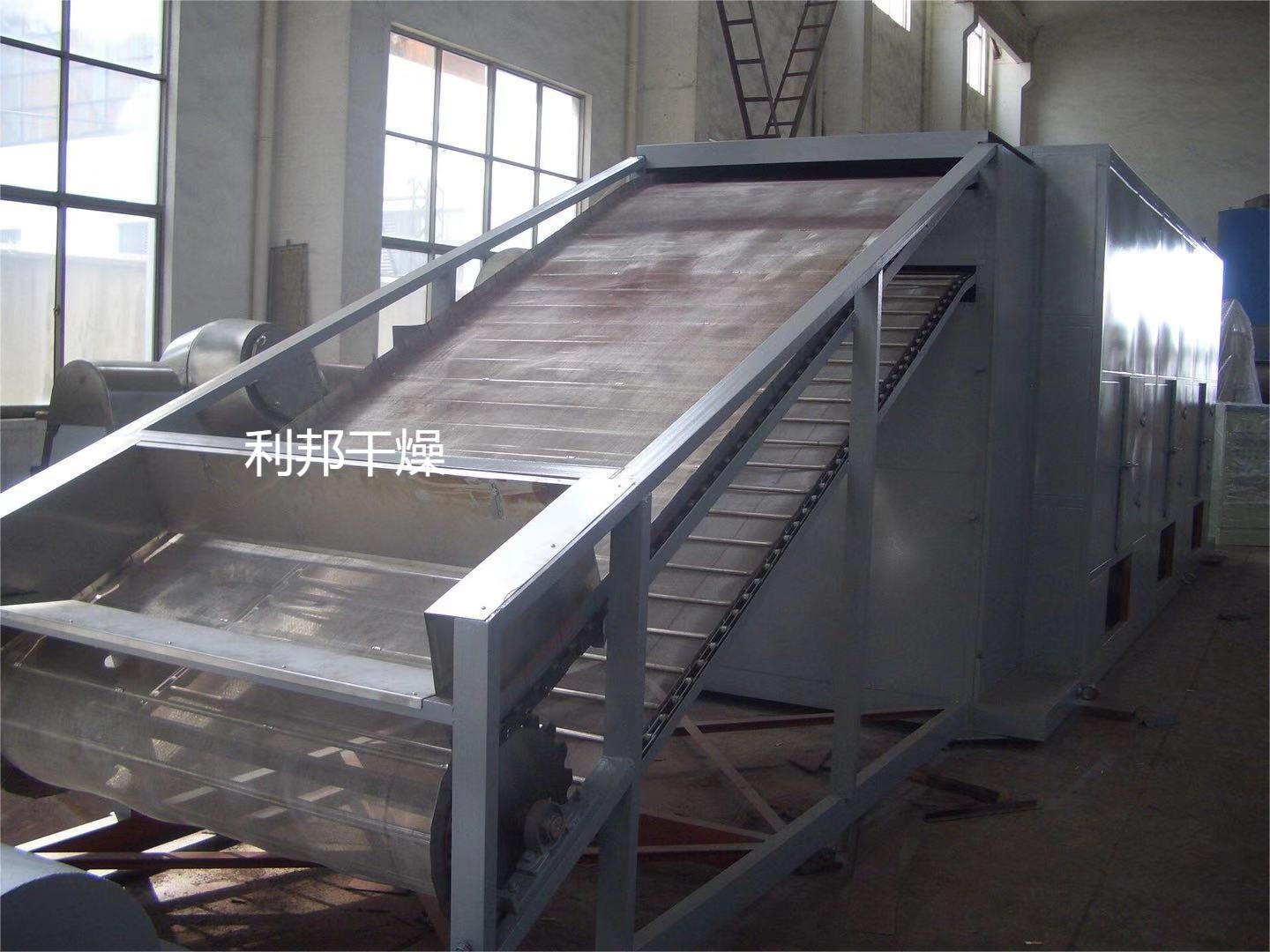 物料由加料器均勻地鋪在網(wǎng)帶上,網(wǎng)帶采用12-60目不銹鋼絲網(wǎng)。由傳動(dòng)裝置拖動(dòng)在干燥機(jī)內(nèi)移動(dòng)。干燥機(jī)由若干單元組成,每一單元熱風(fēng)獨(dú)立循環(huán),部分尾氣由專門排濕風(fēng)機(jī)排出,廢氣由調(diào)節(jié)閥控制,熱氣由下往上或由上往下穿過鋪在網(wǎng)帶上的物料,加熱干燥并帶走水分。網(wǎng)帶緩慢移動(dòng),運(yùn)行速度可根據(jù)物料溫度自由調(diào)節(jié),干燥后的成品連續(xù)落入收料器中。上下循環(huán)單元根據(jù)用戶需要可靈活配備,單元數(shù)量可根據(jù)需要選取。