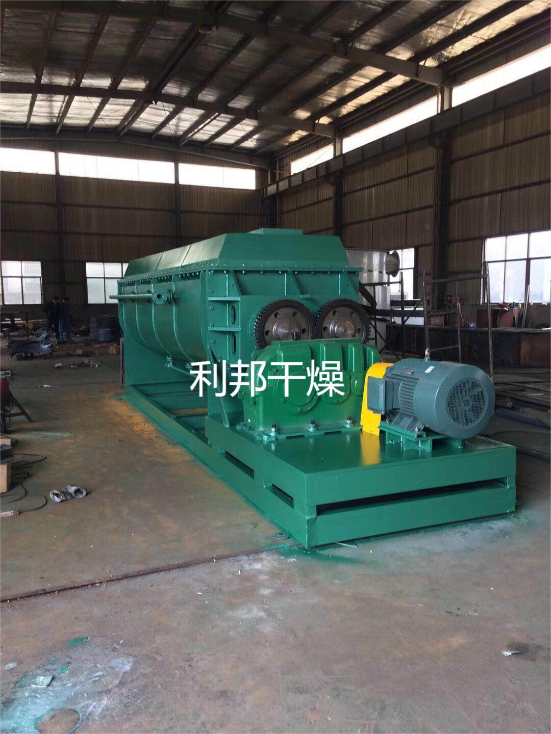 空心軸上密集排列著楔型中空漿葉,熱介質(zhì)經(jīng)空心軸流經(jīng)漿葉。單位有效容積內(nèi)傳熱面積很大,熱介質(zhì)溫度從-40℃到320℃,可以是水蒸汽,也可以是液體型:如熱水、導(dǎo)熱油等。間接傳導(dǎo)加熱,沒(méi)有攜帶空氣帶走熱量,熱量均用來(lái)加熱物料。熱量損失僅為通過(guò)器體保溫層向環(huán)境的散熱。楔型漿葉傳熱面具有自清潔功能。物料顆粒與楔型面的相對(duì)運(yùn)動(dòng)產(chǎn)生洗刷作用,能夠洗刷掉楔型面上附著物料,使運(yùn)轉(zhuǎn)中一直保持著清潔的傳熱面。漿葉干燥機(jī)的殼體為Ω型,殼體內(nèi)一般安排二到四根空心攪拌軸。殼體有密封端蓋與上蓋,防止物料粉塵外泄而充分發(fā)揮作用。