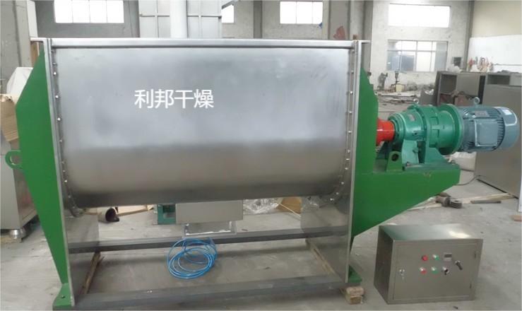 臥式螺帶混合機由安裝于攪拌軸上的內外徑螺旋帶動桶體內物料翻動,使攪拌器在桶體內大范圍翻動物料。攪拌器結構上,螺旋設計成內外、左右互為反螺旋,攪拌器工作時內螺旋帶動靠近軸心處物料做軸心旋轉,軸向由內至兩側推動,外螺旋帶動靠近筒壁物料做軸心旋轉,軸向由兩側至內推動,于是造成物料在筒體內對流循環(huán)、剪切滲混,完成物料在較短時間內快速均勻混合。