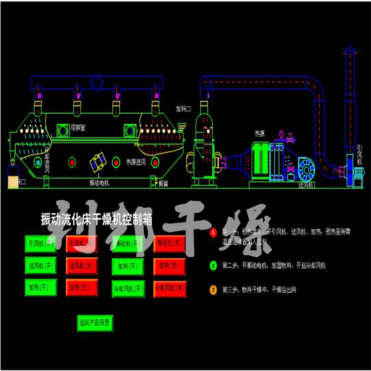 該機(jī)由振動(dòng)電機(jī)拋擲產(chǎn)生激振力,物料在給定方向的激振力的作用下跳躍前進(jìn),同時(shí)床底下輸入的熱風(fēng)使物料處于流化狀態(tài),物料顆粒與熱風(fēng)充分接觸,從而達(dá)到理想效果。物料自進(jìn)料口進(jìn)入機(jī)內(nèi),在振動(dòng)力作用下,物料沿水平方向拋擲向前連續(xù)運(yùn)動(dòng)。熱風(fēng)向上穿過流化床和濕物料換熱,濕空氣經(jīng)旋風(fēng)分離器除塵后由排風(fēng)口排出,干燥物料由排料口排出。