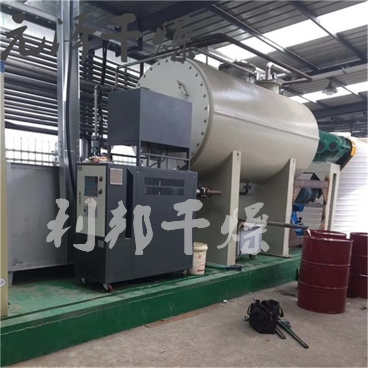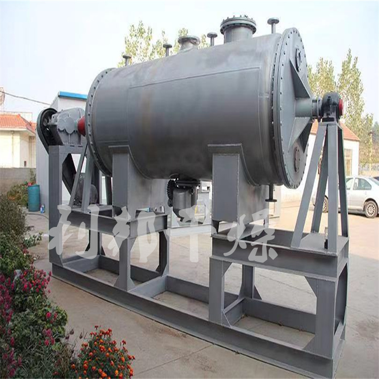 被干燥物料從殼體上方正中間加入,在不斷轉(zhuǎn)動的耙齒的攪拌下,物料與殼體壁接觸時,表面不斷更新,被干燥物料受到蒸汽間接加熱,而使物料水分氣化,氣化的水分由真空泵及時抽走,該機可同時采用夾層與耙齒同時加熱方式,傳熱面積更大,熱效率高,使其獲得更高的干燥效率。由于操作真空度較高,被干燥物料表面水蒸氣壓力遠大于干燥機殼體內(nèi)蒸發(fā)空間的水蒸氣壓力,從而有利于被干燥物料內(nèi)部水分和表面水分的排出,有利于被干燥物料的水分子運動,達到干燥目的。