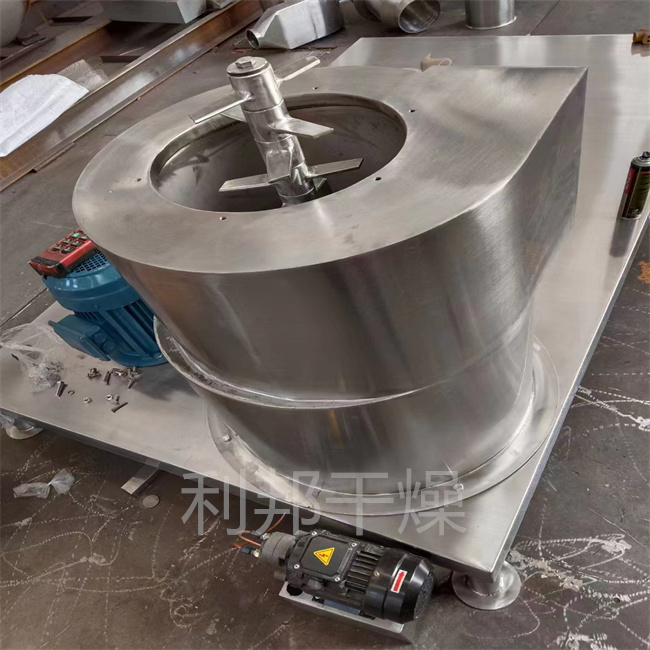熱空氣由入口管以適宜的噴動(dòng)速度從干燥機(jī)底部進(jìn)入攪拌粉碎干燥室,對(duì)物料產(chǎn)生強(qiáng)烈的剪切、吹浮、旋轉(zhuǎn)作用,于是物料受到離心、剪切、碰撞、摩擦而被除數(shù)微粒化,強(qiáng)化了傳質(zhì)傳熱。在干燥機(jī)底部,較大較濕的顆粒團(tuán)在攪拌器的作用下被機(jī)械破碎,濕含量較低、顆粒度較小的顆粒被旋轉(zhuǎn)氣流夾帶上升,在上升過程中進(jìn)一步干燥。由于氣固兩相作旋轉(zhuǎn)流動(dòng),固相慣性大于氣相,固氣兩相間的相對(duì)速度較大,強(qiáng)化兩相間的傳質(zhì)傳熱,所以該機(jī)生產(chǎn)強(qiáng)度高。