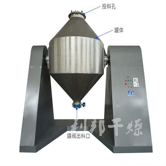 雙錐形筒體:由兩個(gè)對(duì)稱的圓錐體與中間圓柱體連接而成,筒體可繞水平軸旋轉(zhuǎn)(轉(zhuǎn)速通常為 5-15r/min),確保物料均勻翻動(dòng)。
