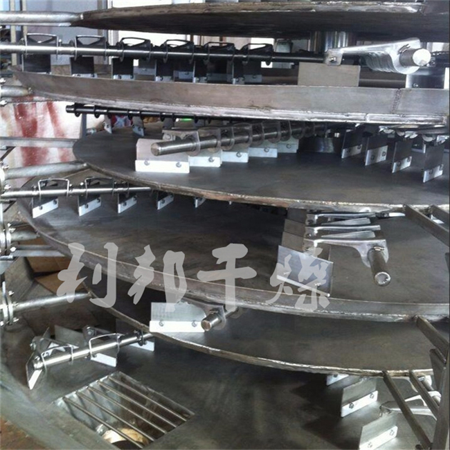 濕物料自加料器連續(xù)地加到干燥器上部層干燥盤上,帶有耙葉的耙臂作回轉(zhuǎn)運(yùn)動使耙臂作回轉(zhuǎn)運(yùn)動使耙葉連續(xù)地翻抄物料。物料沿指數(shù)螺旋線流過干燥盤表面,在小干燥盤上的物料被移送到外緣,并在外緣落到下方的大干燥盤外緣,在大干盤上物料向里移動并從中間落料口落如下一層小干燥盤中。大小干燥盤上下交替排列,物料得以連續(xù)地流過整個干燥器。中空的干燥盤內(nèi)通入加熱介質(zhì),加熱介質(zhì)形式有飽和蒸汽、熱水和導(dǎo)熱油,加熱介質(zhì)由干燥盤的一端進(jìn)入,從另一端導(dǎo)出。已干物料從后一層干燥盤落到殼體的底層,后被耙葉移送到出料口排出。濕份從物料中逸出,由設(shè)在頂蓋上的排濕口排出,真空型盤式干燥器的濕氣由設(shè)在頂蓋上的真空泵口排出。從底層排出的干物料可直接包裝。通過配加翅片加熱器、溶劑回收冷凝器、袋式除塵器、干料返混機(jī)構(gòu)、引風(fēng)機(jī)等輔機(jī),可提高其干燥的生產(chǎn)能力,干燥膏糊狀和熱敏性物 料,可方便地回收溶劑,并能進(jìn)行熱解和反應(yīng)操作。