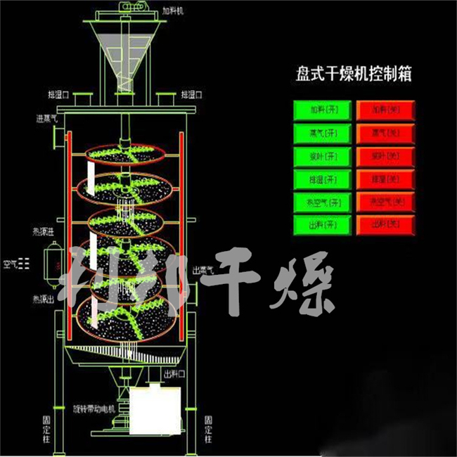 濕物料自加料器連續(xù)地加到干燥器上部層干燥盤上,帶有耙葉的耙臂作回轉(zhuǎn)運動使耙臂作回轉(zhuǎn)運動使耙葉連續(xù)地翻抄物料。物料沿指數(shù)螺旋線流過干燥盤表面,在小干燥盤上的物料被移送到外緣,并在外緣落到下方的大干燥盤外緣,在大干盤上物料向里移動并從中間落料口落如下一層小干燥盤中。大小干燥盤上下交替排列,物料得以連續(xù)地流過整個干燥器。中空的干燥盤內(nèi)通入加熱介質(zhì),加熱介質(zhì)形式有飽和蒸汽、熱水和導熱油,加熱介質(zhì)由干燥盤的一端進入,從另一端導出。已干物料從后一層干燥盤落到殼體的底層,后被耙葉移送到出料口排出。濕份從物料中逸出,由設在頂蓋上的排濕口排出,真空型盤式干燥器的濕氣由設在頂蓋上的真空泵口排出。從底層排出的干物料可直接包裝。通過配加翅片加熱器、溶劑回收冷凝器、袋式除塵器、干料返混機構、引風機等輔機,可提高其干燥的生產(chǎn)能力,干燥膏糊狀和熱敏性物 料,可方便地回收溶劑,并能進行熱解和反應操作。